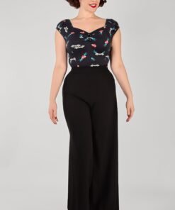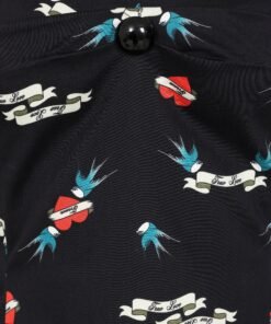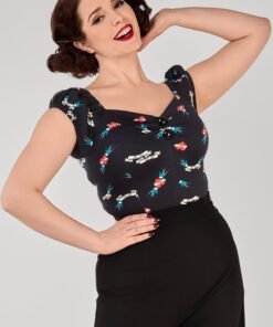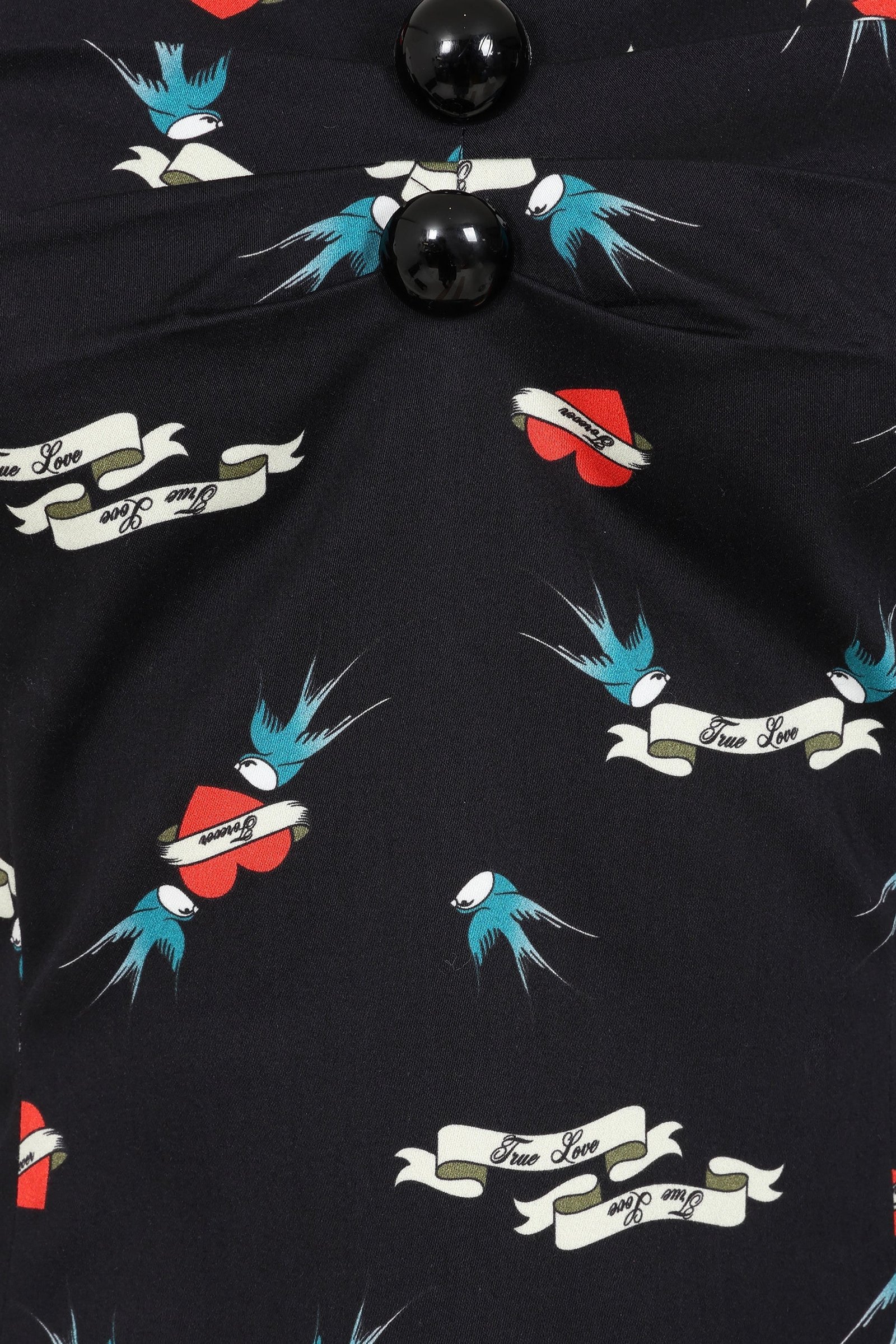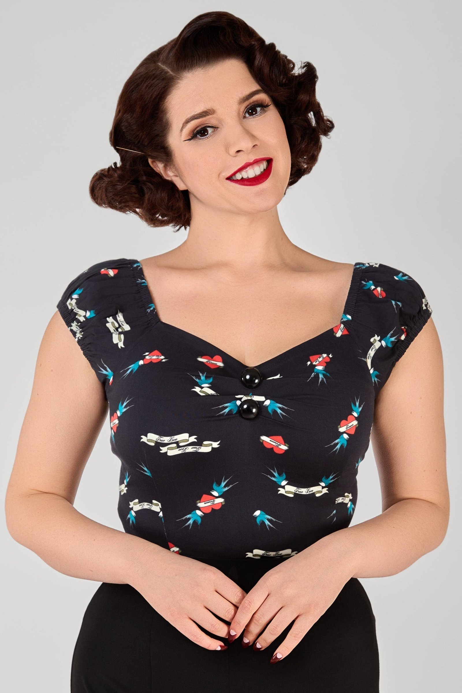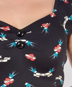 We had to create the Dolores True Love Print Top for you! Sail away into rockabilly romance with this bold, ink-inspired print! Featuring soaring blue swallows, timeless tattoo-style banners, and fiery red hearts declaring “True Love,” this design brings a touch of retro rebellion to any outfit. Simply perfect for styling with denim or a wiggle skirt, the pin-up possibilities are endless!