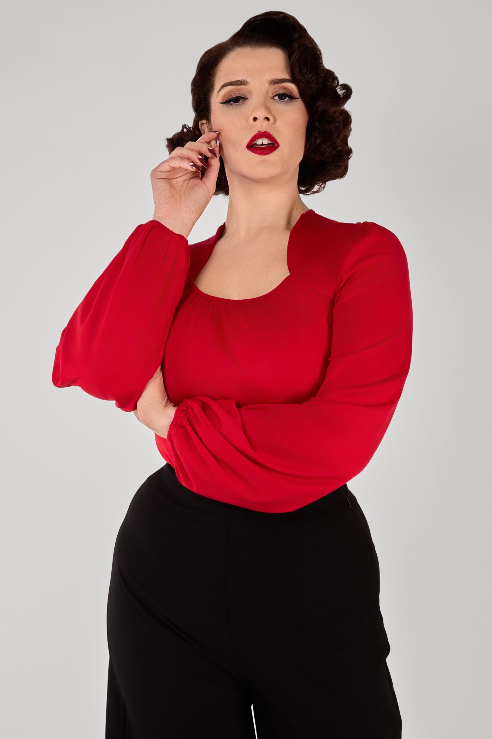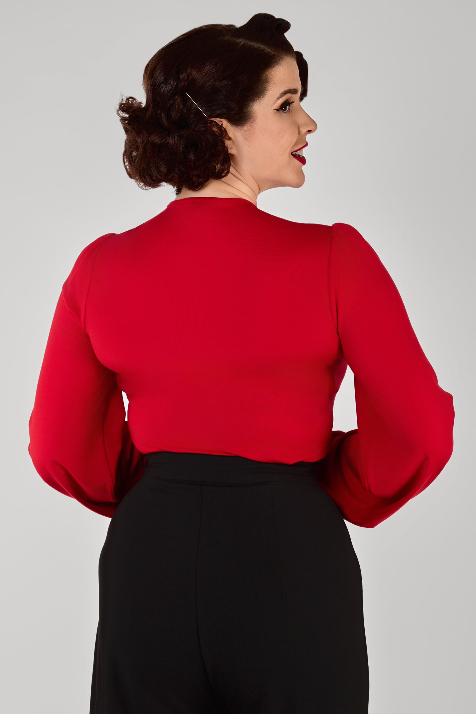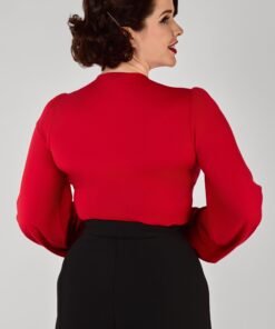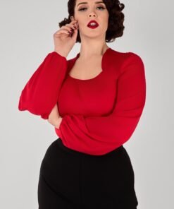 The Leslie Red Balloon Sleeve Jersey Top combines comfort with effortless retro style. Soft jersey fabric drapes across the bodice and sleeves. Dress up or down, the Leslie Top is versatile and fabulous!